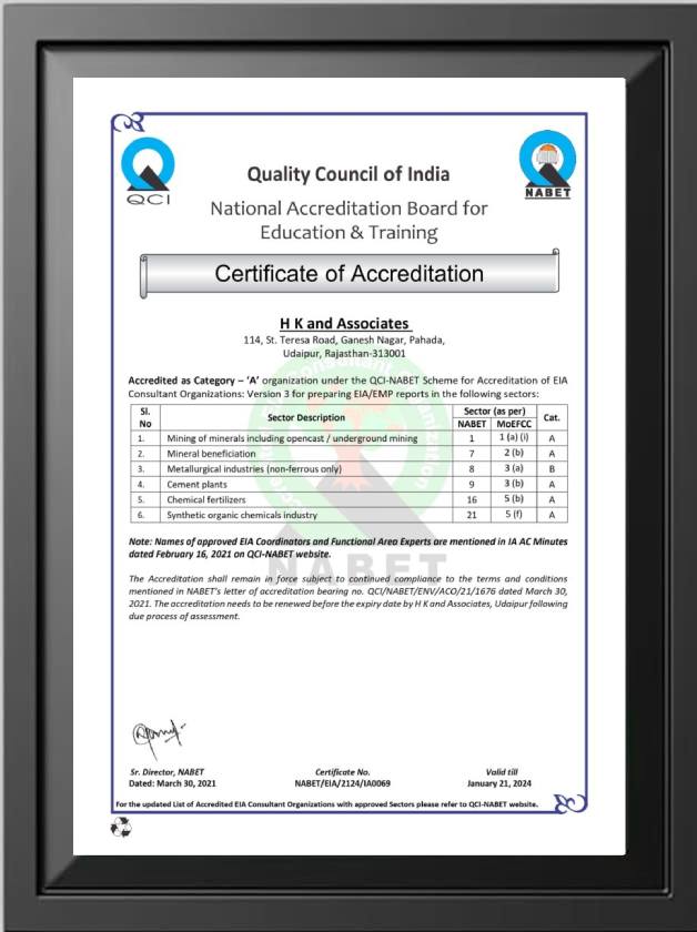H K & Associates is an ISO 9001:2015 certified and NABET-accredited A Category EIA Consultancy, also recognized by MSME, Government of India. Accredited by NABET and QCI, we are committed to delivering trusted and professional services.